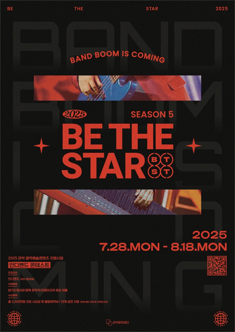 [클래식비즈 김일환 기자] 관악문화재단이 인디밴드 콘테스트 ‘Be The Star 시즌5’ 참가자를 오는 7월 28일(월)부터 8월 18일(월)까지 모집한다. 참가 자격은 미발매 창작곡 실연이 가능한 밴드로, 전 장르 참여가 가능하다.
