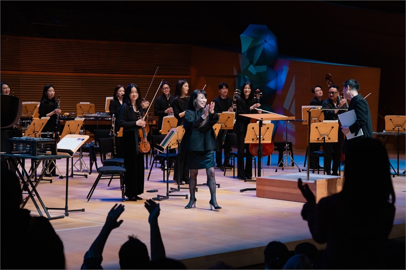 한국 현대음악을 대표하는 TIMF앙상블이 지난 6월 로스앤젤레스 월트 디즈니 콘서트홀에서 열린 LA필하모닉 ‘서울 페스티벌’ 무대에서 ‘구갈론’을 연주한 뒤, 작곡가 진은숙과 함께 관객에게 인사하고 있다. ⓒFarah Sosa, provided courtesy of the LA Phil/TIMF앙상블 제공