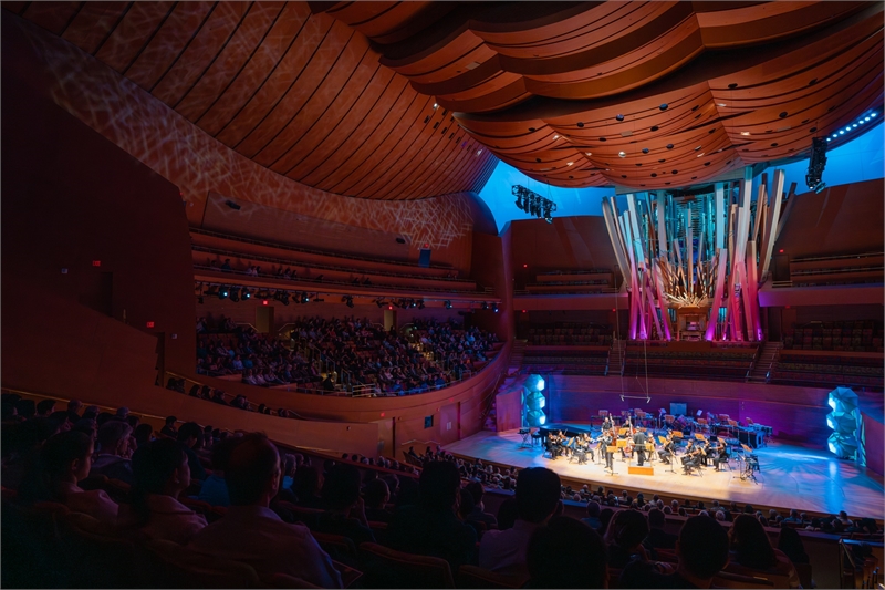 한국 현대음악을 대표하는 TIMF앙상블이 지난 6월 로스앤젤레스 월트 디즈니 콘서트홀에서 열린 LA필하모닉 ‘서울 페스티벌’ 무대에서 진은숙의 ‘구갈론’을 연주하고 있다. ⓒFarah Sosa, provided courtesy of the LA Phil/TIMF앙상블 제공