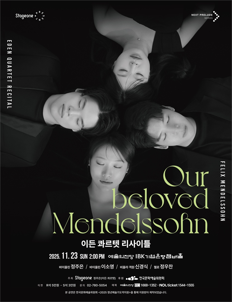 이든 콰르텟은 이번 무대를 통해 멘델스존의 음악 세계를 단순히 ‘연주’하는 것을 넘어, 그가 남긴 감정의 궤적과 시대의 숨결을 오늘의 시선으로 되살린다. 네 명의 연주자는 작품마다 깃든 서정과 격정을 치밀한 호흡으로 직조하며, 각 악기의 개성을 넘어 하나의 유기적 흐름으로 청중을 몰입시킨다.