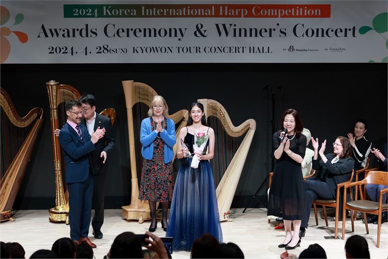 ‘2026 대한민국 국제 하프 콩쿠르’가 내년 3월 29일부터 4월 5일까지 교원투어 콘서트홀에서 개최된다. 사진은 2024 대한민국 국제 하프 콩쿠르에서 영프로페셔널 부문 1위에 오른 르네 야다브의 수상 모습. ⓒ대한민국국제하프콩쿠르 제공