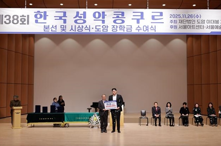 ‘제38회 한국성악콩쿠르’에서 전체 대상을 수상한 베이스 박성민이 상장과 장학금을 받고 있다. ⓒ도암이대봉재단 제공