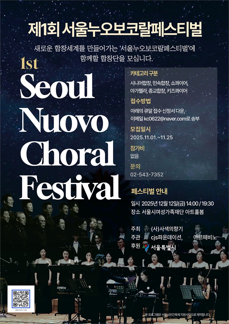 사색의향기는 오는 12월 12일(금) 서울시여성가족재단 1층 아트홀 봄에서 ‘2025 서울누오보코랄페스티벌’을 개최한다. 이 행사는 서울시 민간축제지원 프로그램으로 후원을 받아 진행되며, 서울 시민들이 합창을 통해 서로를 이해하고 공동체적 가치를 공유하는 새로운 시민문화축제로 도약하고자 기획됐다.