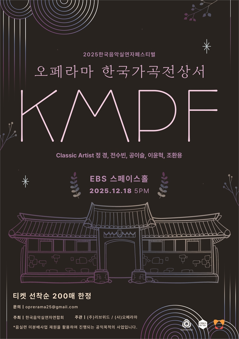 [클래식비즈 민은기 기자] 2025한국음악실연자페스티벌(KMPF)의 일환으로 ‘한국가곡 전상서’가 오는 18일(목) 오후 5시 고양시 일산동구 한류월드로 EBS 스페이스홀에서 열린다. KMPF(Korean Music Performers’ Festival)는 한국음악실연자연합회(음실련)의 미분배재원을 활용한 공익 공연사업이다.