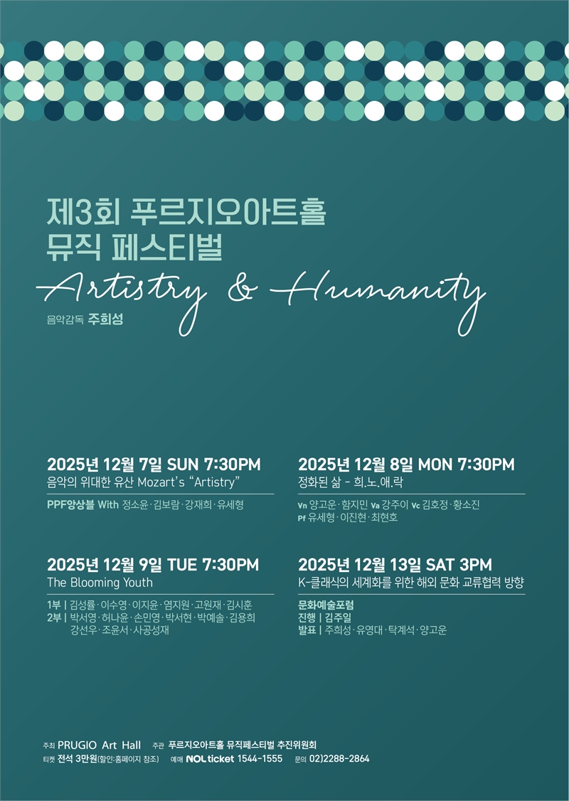 제3회 푸르지오아트홀 뮤직페스티벌이 오는 12월 7일(일)부터 13일(토)까지 서울 을지로4가 푸르지오아트홀에서 열린다. 급변하는 시대 속에서도 음악이 지닌 본질적 가치와 인간적 울림을 되새기는 장을 마련한다.