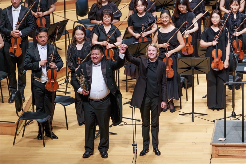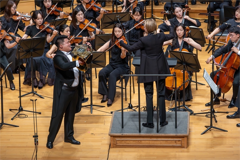 베를린 필하모닉 오케스트라 호른 수석 윤 젱이 지난 8월 22일 롯데콘서트홀에서 독일의 MZ세대 여성 지휘자 루트 라인하르트의 지휘로 서울시향과 협연하고 있다. ⓒ서울시향 제공