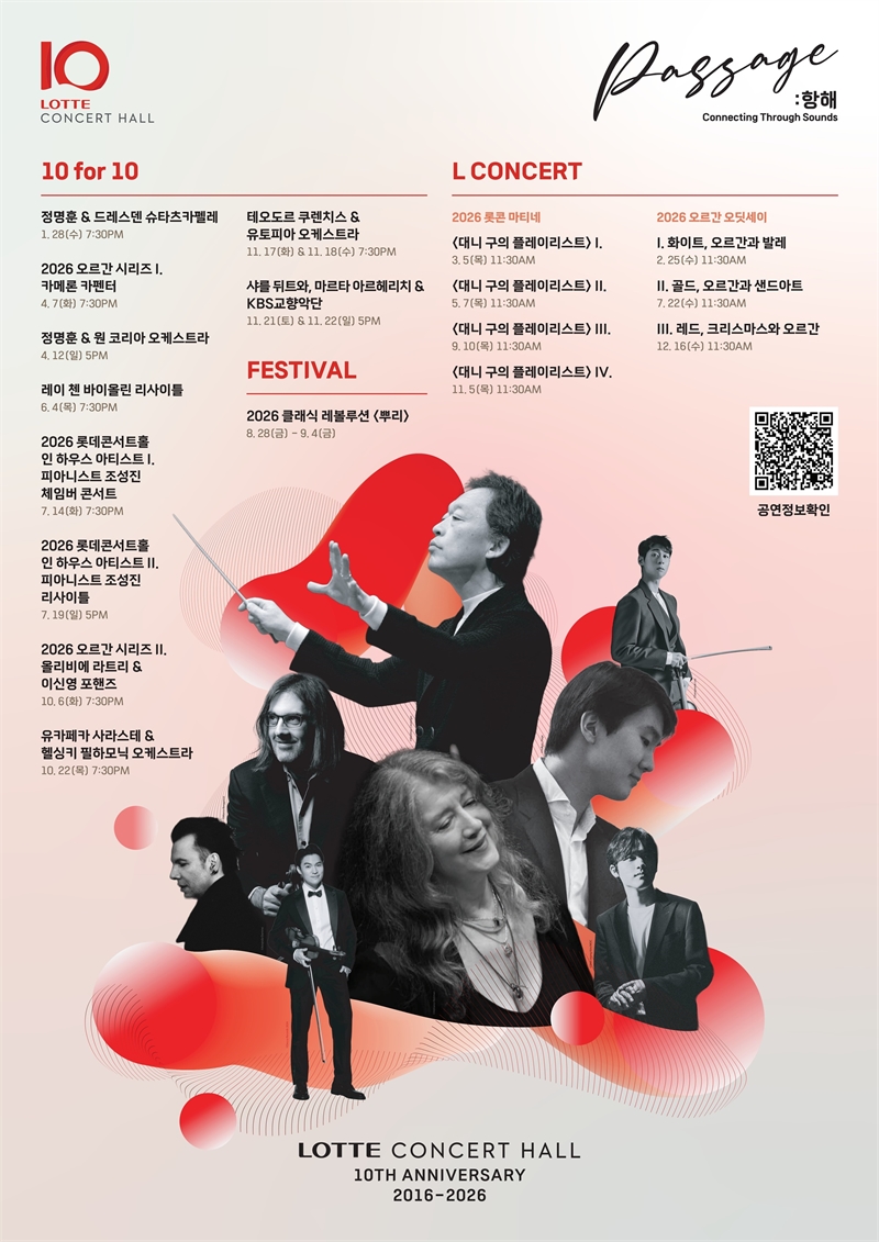 롯데콘서트홀은 2026년 개관 10주년을 맞아 ‘Passage(항해)’라는 메시지를 엮은 내년 공연 라인업을 10일 공개했다. 지난 10년의 여정을 돌아보며 새로운 10년을 향한 출발을 담고 있다. 이는 클래식 음악을 넘어 모든 장르와 시대, 취향을 연결하는 통로가 되겠다는 의지와 악보 한 줄 한 줄에 담긴 의미를 온전히 전달하겠다는 비전을 반영한 연간 프로그램이다.