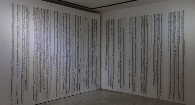 ‘이토록 희미하고 짙은’은 삶과 죽음, 애도와 염원이 만나는 경계의 형상이며 시간을 매개하는 존재론적 장치가 작동된다. 동망은 산업적 규격성과 기계적 반복의 물질성을 갖지만, 작가는 그 틈을 미세하게 흔들어 ‘되기(becoming)’의 구조로 전환한다. 고정된 사물로서의 수의가 아니라 새로운 주체가 되기 위해 다시 써 내려가는 일종의 팔림프세스트(palimpsest)를 만든다.