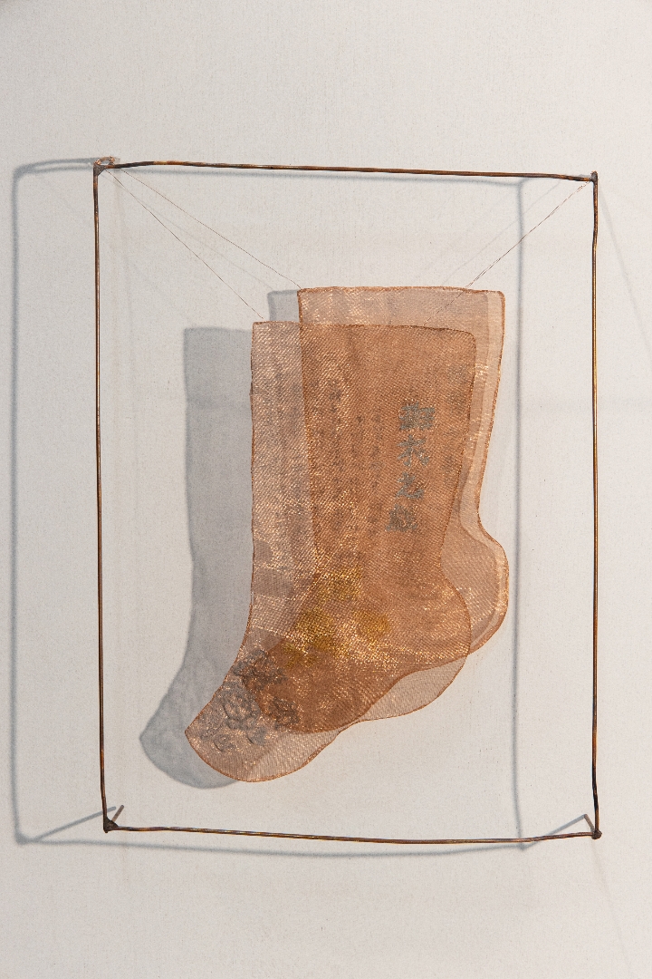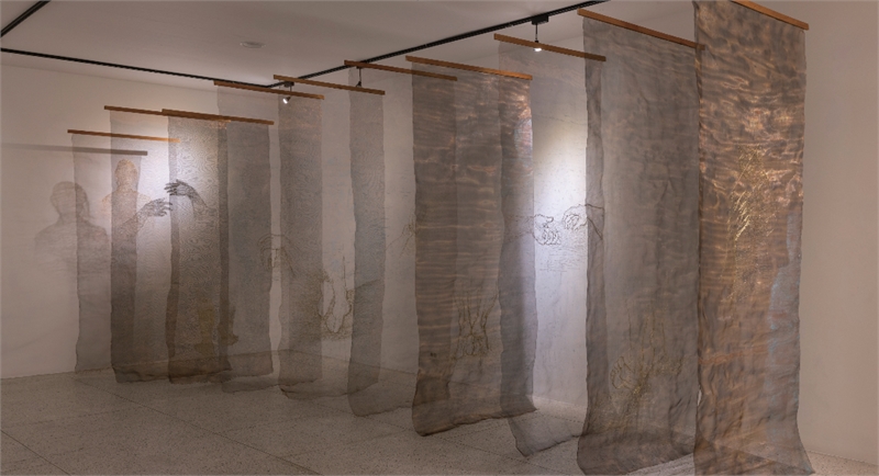‘당신의 시간’에서는 여러 장의 동망(銅網)이 중첩되며, 조명과 관람자의 시점에 따라 달리 보이는 인생의 결이 드러난다. 금사로 새긴 손과 발은 오랜 노동의 시간을 상징하며, 여성들의 노동이 곧 공동체의 심줄이었음을 새삼 확인하게 한다.