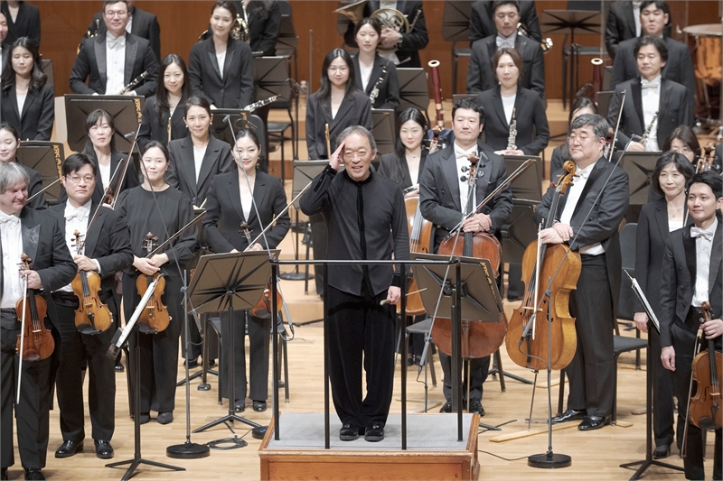 정명훈이 KBS교향악단과 베토벤 교향곡 9번 ‘합창’을 연주한 뒤 관객에게 거수경례하는 포즈로 인사하고 있다. ⓒKBS교향악단 제공