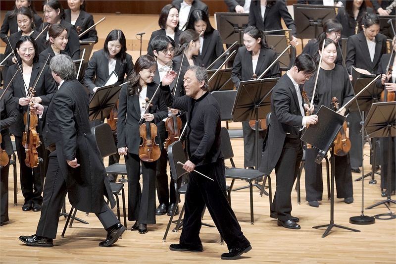 정명훈이 KBS교향악단과 베토벤 교향곡 9번 ‘합창’을 연주한 뒤 악장과 함께 퇴장하고 있다. ⓒKBS교향악단 제공