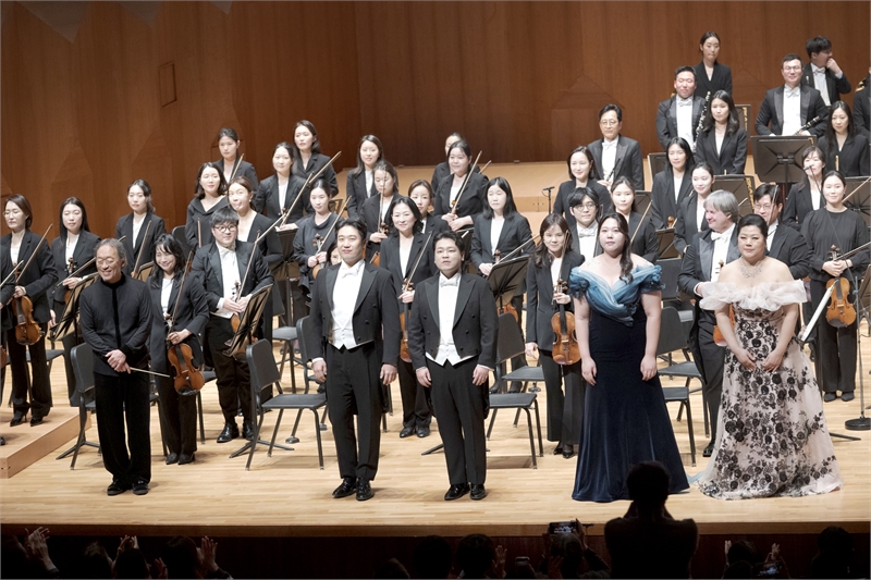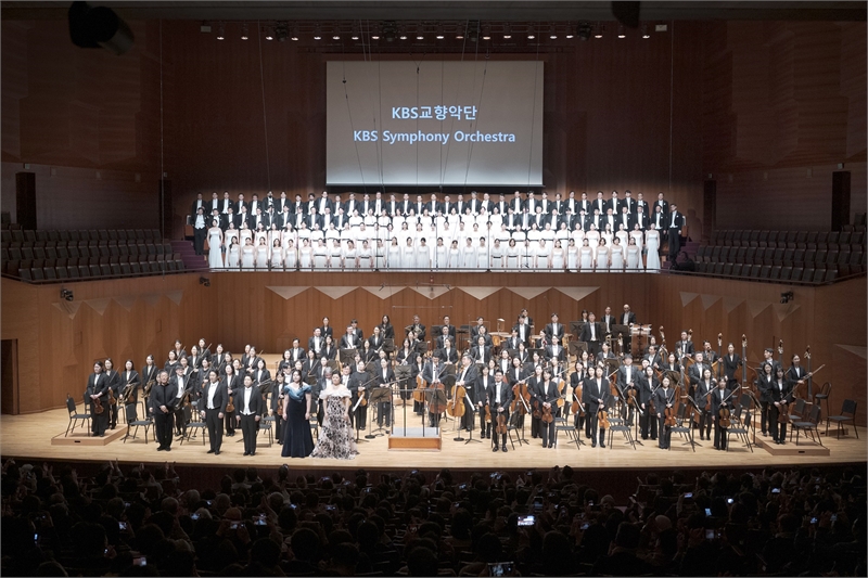정명훈이 지휘하는 KBS교향악단이 베토벤 교향곡 9번 ‘합창’을 연주한 뒤 협연자들과 함께 인사하고 있다. ⓒKBS교향악단 제공
