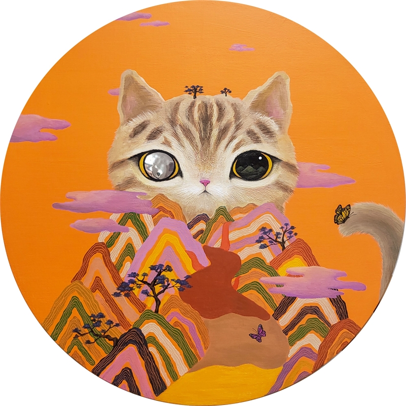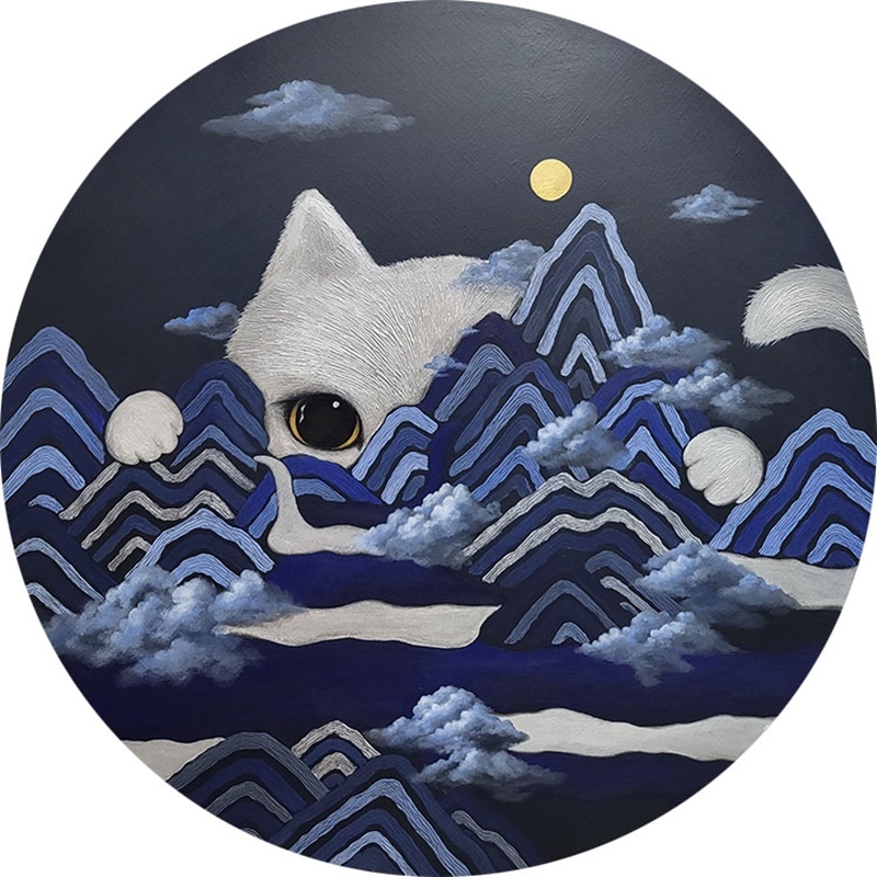 작품 속 고양이는 산맥 사이로 얼굴을 내밀고 구름과 밤하늘, 달빛 사이를 유영하며 관람객을 ‘묘한 경계’ 위로 이끈다. 그 경계는 단순히 사회적 현실에 대한 관찰을 넘어, 우리가 서 있는 자리와 행복의 방향을 스스로에게 되묻게 하는 지점이기도 하다.